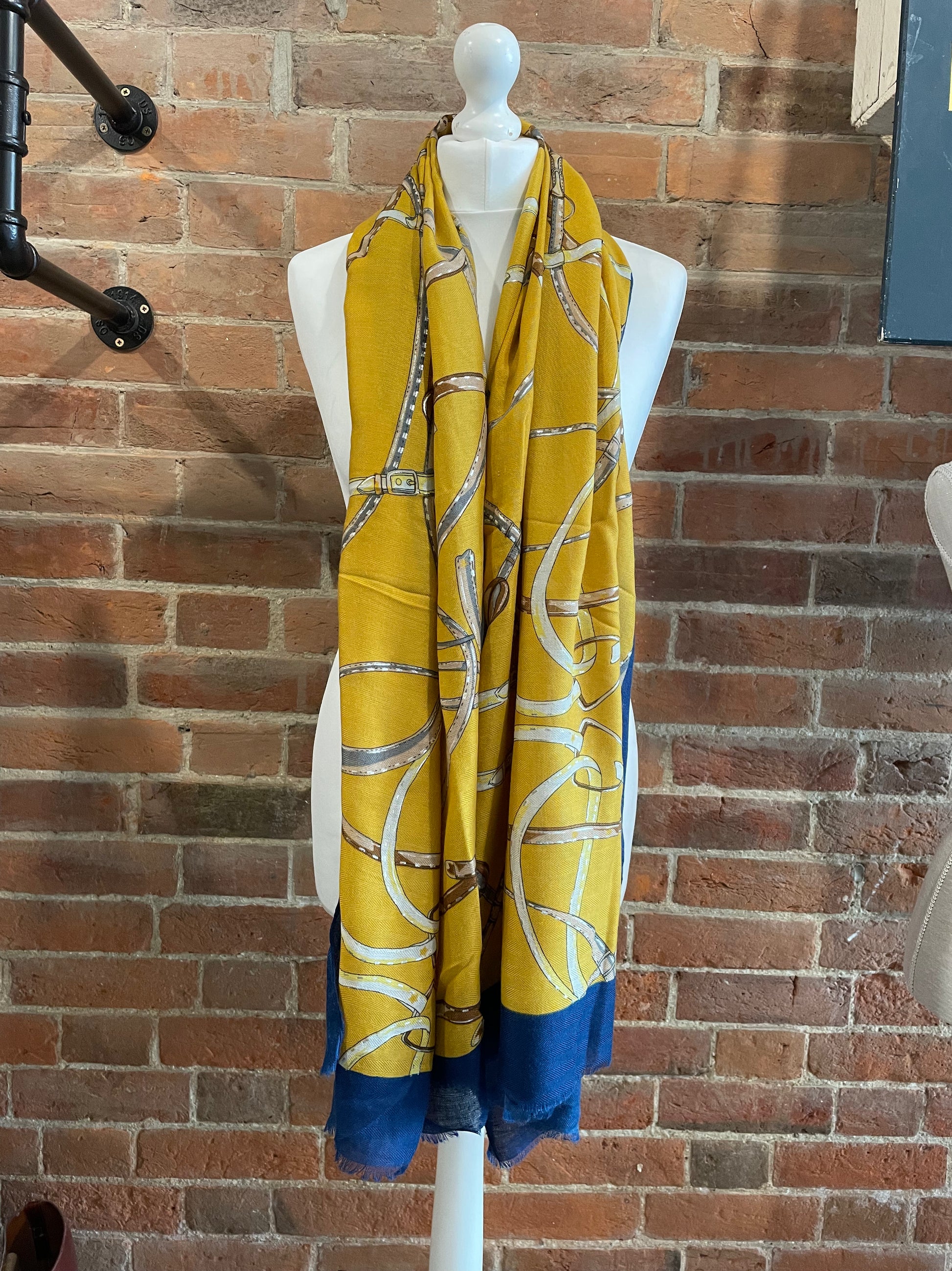 simple equestrian print scarf in a mustard yellow with navy trim and pretty bridle and snaffle details!